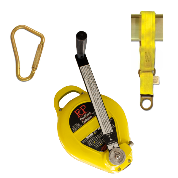 The system includes the R50G self retracting lifeline rescue winch with 50 feet of cable. It includes the #62 carabiner. It includes the 1336-WP three foot anchor sling (longer sizes are available if needed).