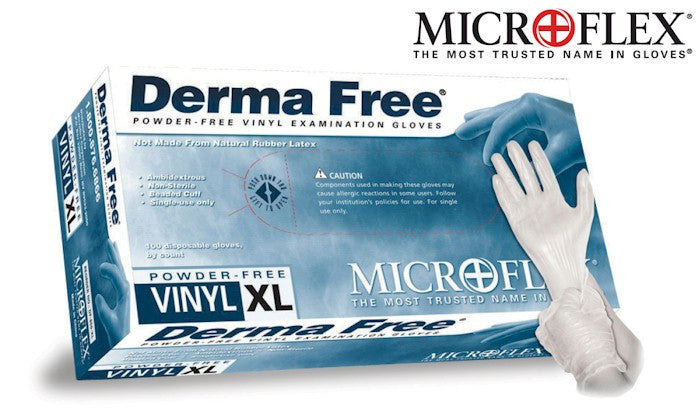 Comfort, performance and value in a powder-free medical examination glove. Backed by the industrys leading quality system, Derma Free powder-free vinyl gloves provide solid hand protection for a variety of applications. Thicker than typical vinyl gloves, the Derma Free glove is 100% synthetic and features a smooth surface for more natural tactile sensitivity.