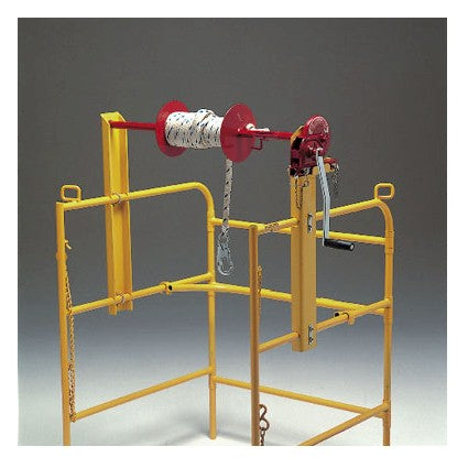 This device is for raising/lowering equipment into manholes. The guard is 43.5" wide by 42.5" high.