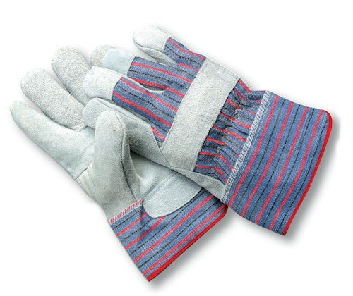 Ecomomy grade split leather palm work gloves have a reinforced knuckle strap, pull tab, full index finger and fingertips. This style features a striped canvas back with matching starched safety cuff.