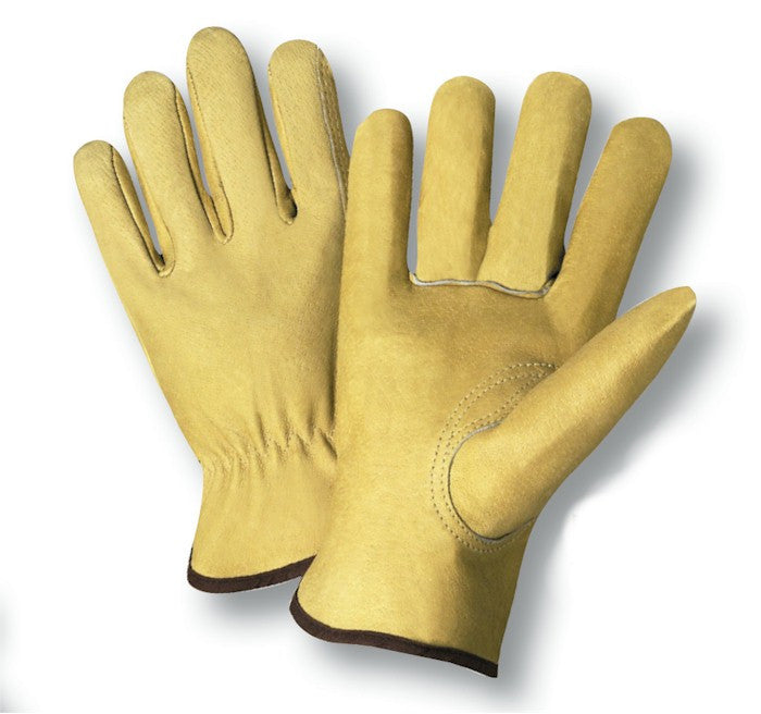 Unlined grain pigskin drivers glove is extremely breathable and resists moisture to remain pliable. Feature keystone thumb for manueverability. Shirred elastic back and slip-on cuff with color-coded hem for size identification.