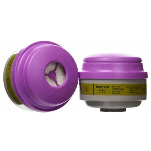 The North 75SCP100L is a double stacked cartridge and filter. Essentially what you get is a Defender 75SCPL vapor cartridge with a 75SCP100 particulate filter permanently affixed on top of it. It fits the 7700, 5400 and 7600 series North respirators.